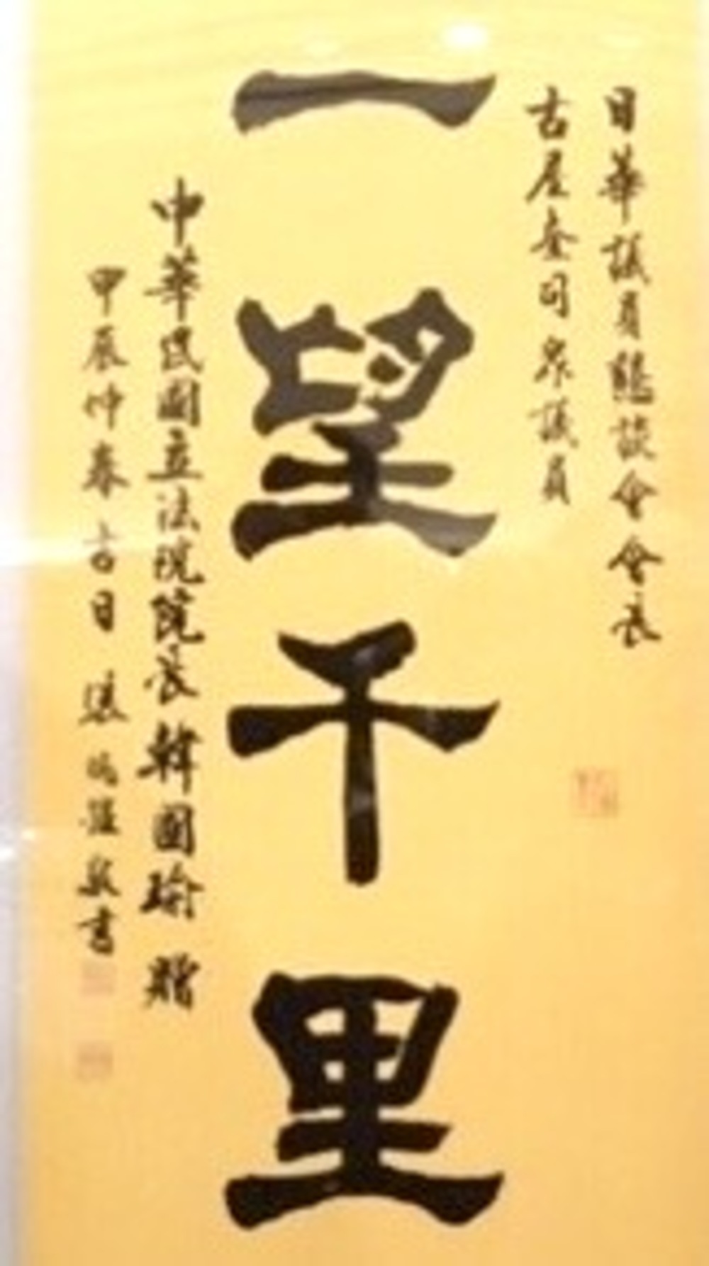 我應邀致詞時,特別強調基隆書法人才濟濟,基隆有「書法之都」美譽,基隆名家書畫作品,常被收藏。我以張炳煌的書法為例,不僅為幾位総統題字書寫,他的嘉言名句,很受歡迎,日本前首相石破茂當眾議員時,辦公室就掛張炳煌的墨寶「雪中松柏」。