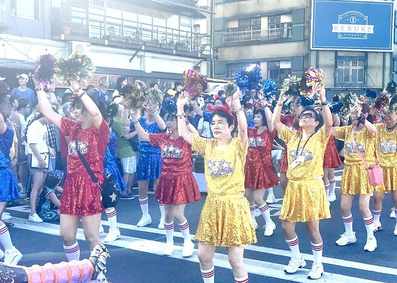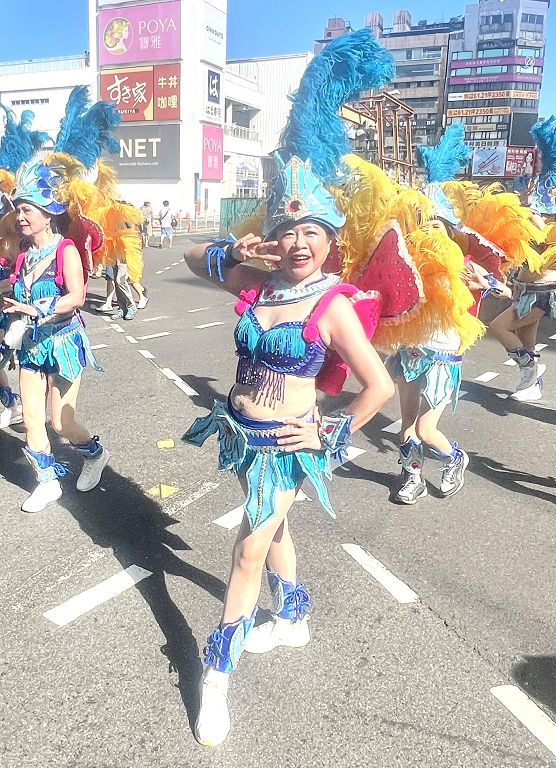 3、森巴豉隊和舞群增多,沿途鼓聲響起,基隆快樂聯盟協會初次露臉,紅黃兩色耀眼服裝和彩球在揮舞行進。