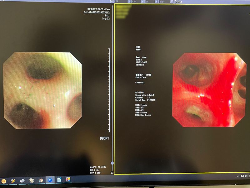 楊朝能醫師回憶,第一次清理時宛如為肺部「清淤」,從病人的鼻咽、喉咽,一路到左右支氣管,都堆積了大量濃痰與泥沙。團隊在不傷害呼吸道的情況下,盡可能移除細沙,考量殘留泥沙會隨分泌物逐步排出,一週後再次進行第二次支氣管鏡檢查與清理;這時從支氣管鏡檢查中,可以看出氣管已明顯乾淨許多,濃痰與泥沙大幅減少,黏膜也開始修復,患者呼吸狀況大幅改善。