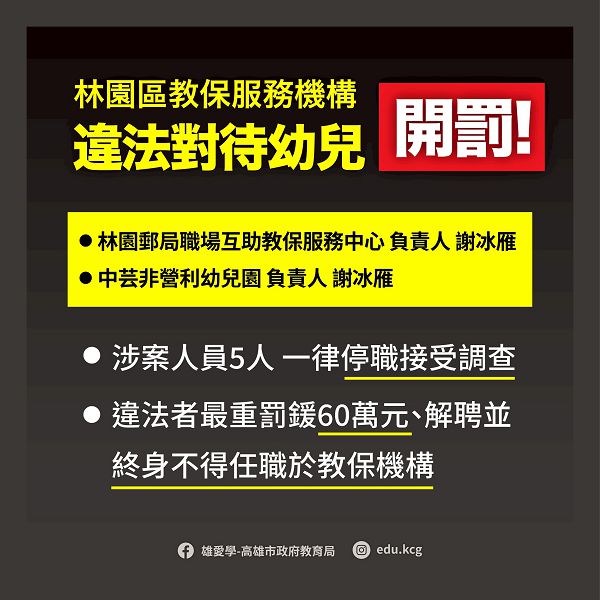 【記者陳志昌高雄報導】針對林園區郵局職場互助教保服務中心及中芸非營利幼兒園違法對待幼兒一案,高市府教育局表示,該局接獲陳情後,立即指示園所保存並送交近30日內的監視器畫面,並動員超過10人分組檢視,經查已發現有5名教保服務人員涉有對幼兒罰站、拍打頭部、捏臉、半蹲、禁止如廁及要求跑步等不當行為,已依法將5名涉案人員停職,並由專案小組進一步調查,以釐清受害幼兒人數及具體情節。