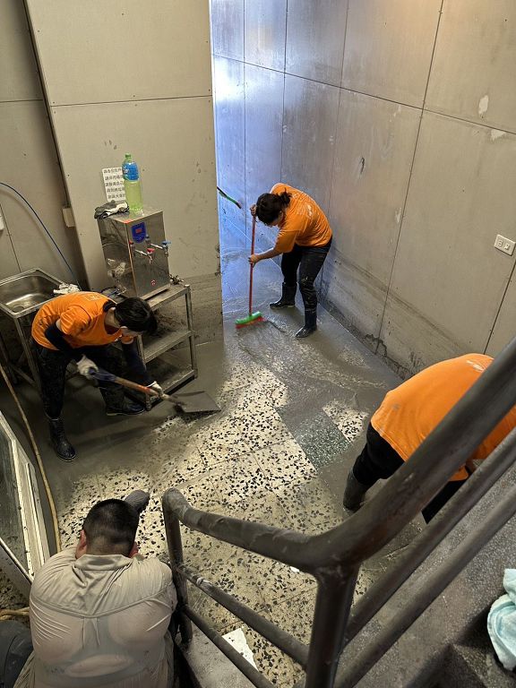 「築光計畫」並不僅限於物資整理。他們也協助清掃;還有同學則走進安置所,陪伴受災的長者與孩童。