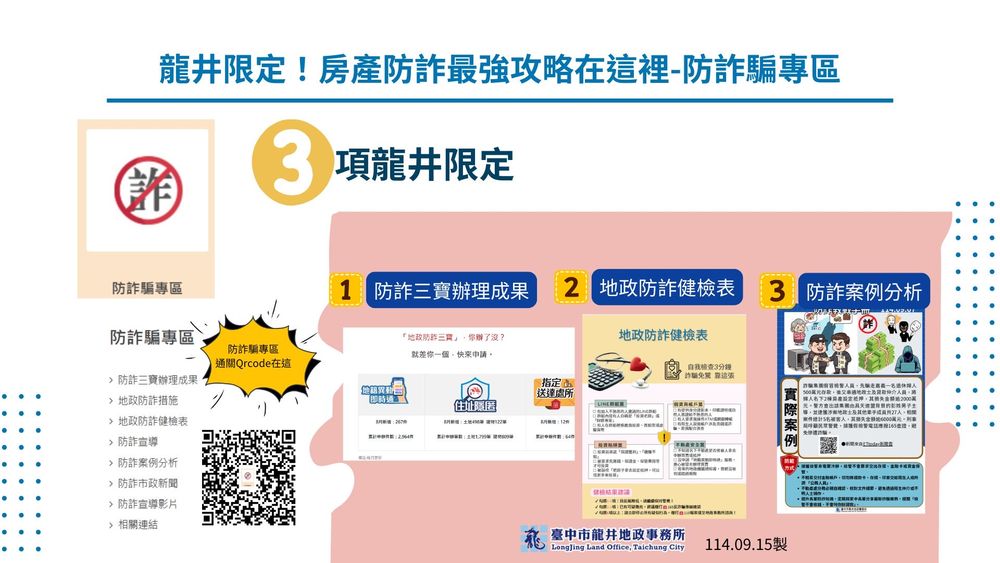 【記者楊川欽台中報導】面對層出不窮的不動產詐騙事件,台中市龍井地政事務所主動出擊,在官網建置「防詐騙專區」,彙整多項實用資訊與宣導資源,內容包含仿165打詐儀錶板的「地政防詐三寶」辦理成果、地政防詐措施、防詐宣導素材、防詐案例分析、市政新聞、防詐健檢表及相關連結等,協助民眾即時掌握防詐知識,全面強化財產安全防護網,防詐騙專區詳見(https://gov.tw/gEV)。