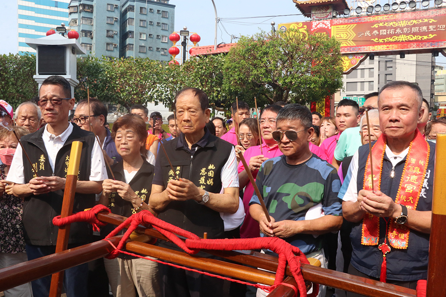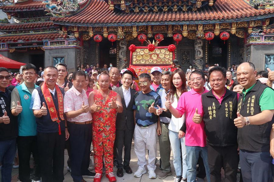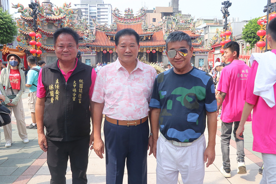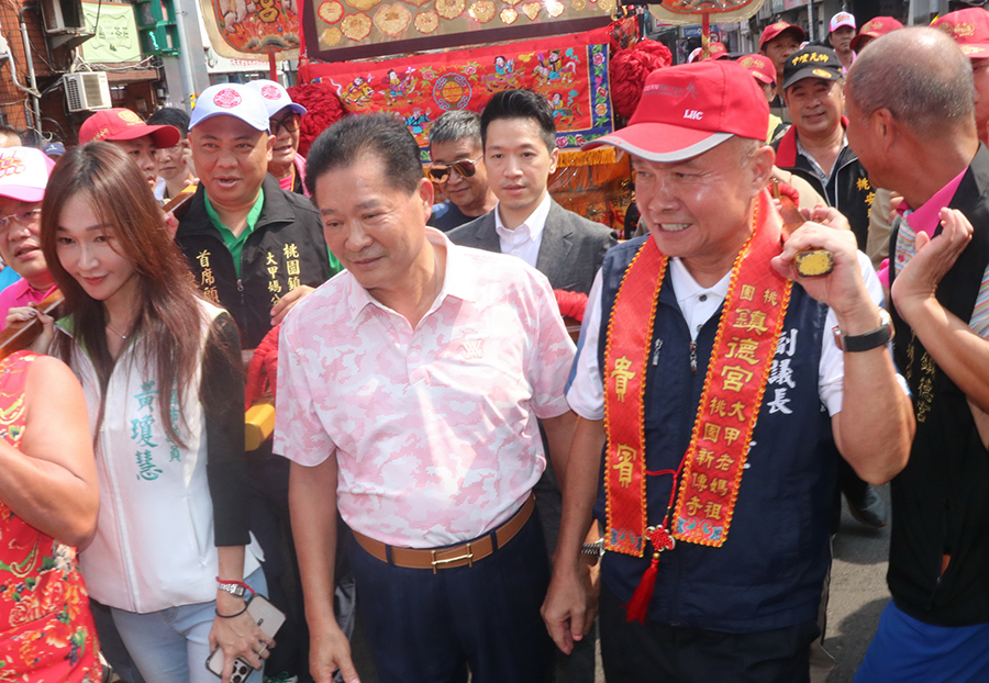 【記者鍾陽正桃園報導】台中大甲鎮瀾宮天上聖母應分靈廟(桃園鎮德宮)之邀請,首度由鎮瀾宮副董事長鄭銘坤與鎮德宮主委林國賢親率龐大遶境隊伍陣容,於11日上午北上桃園徒步巡行桃園及八德兩地區重要街道遶境賜福。媽祖鑾轎抵達大廟景福宮及慈護宮時,身兼兩宮廟主委簡征潭除依禮隆重設香案接聖駕,並與桃市議會副議長李曉鐘、市議員黃瓊惠、黃家齊、桃園區長許敏松、總統府副秘書長何志偉等人親自扶轎,虔誠祈請天上聖母保佑國泰民安。景福宮副主委陳正忠、蘇家明、總幹事李詩明、慈護宮榮譽主委吳正宗、總幹事許萬達均出席熱情接待,場面相當熱鬧。