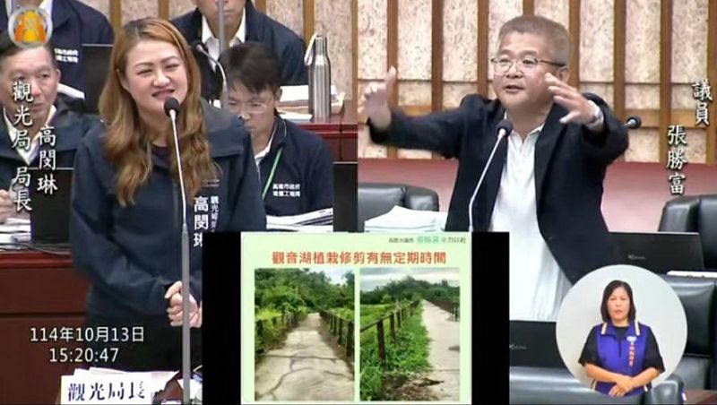 張勝富說,每逢雨後星個兩期,觀音湖步道旁就會雜草叢生,雖有人定期修剪,但生長過快來不急修剪,因路段涉及觀光局與水利局權責,必須兩個局處要協調同時修剪。觀光局長高閔琳答覆,會與水利局協商同時定期修剪。