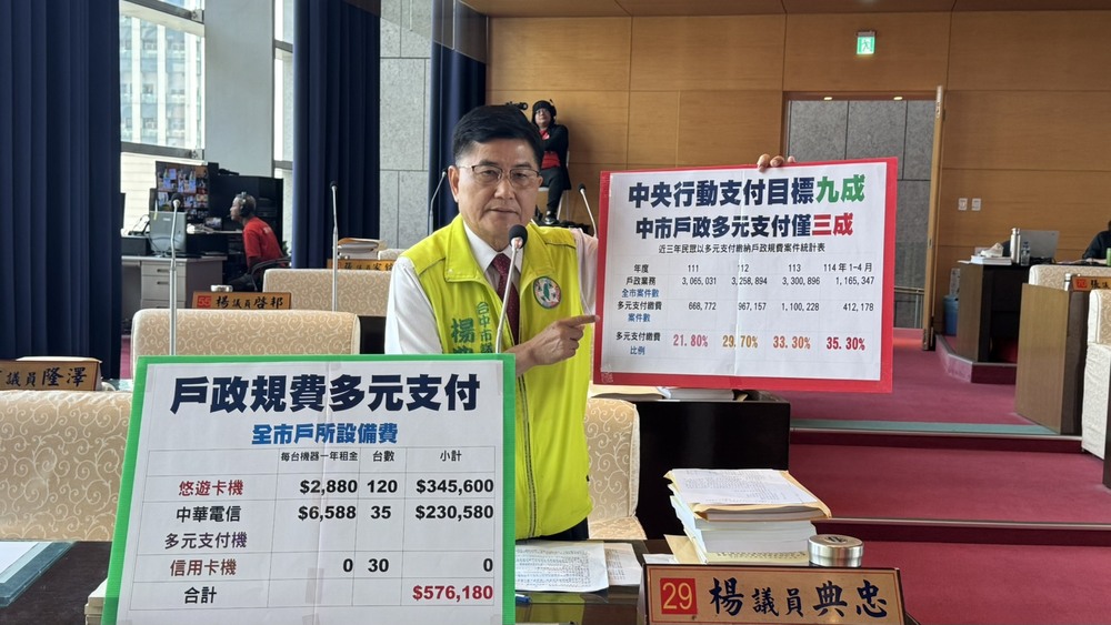 台中市議會進行民政業務質詢,市議員楊典忠針對「多元支付繳納戶政規費」提出質詢,楊典忠表示,台中市政府推動多元支付十多年,但民眾以多元支付繳納戶政規費的案件比例僅約三成多,遠低於中央2025年普及率達90%目標,全市戶政事務所已設置多元支付設備,包括120台悠遊卡機、35台多元支付機、30台信用卡機,光租金一年就花費超過57萬元,但使用率只有三成左右,他要求民政局長應更積極推動多元支付,明年戶政規費多元支付比例目標至少要及格達到60%。