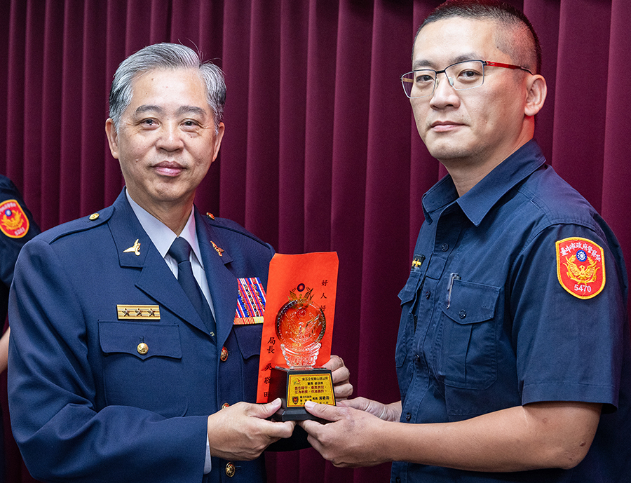 【記者許順德臺中報導】中市警五分局東山派出所警員曾俊榕從鬼門關前挽救燒炭輕生的母女,其忠勤精神展露無遺,使他膺選「好人好事楷模」;警察局長吳敬田在局務會報公開表揚曾員,致贈警察公仔水晶獎座及千元禮券以資鼓勵。