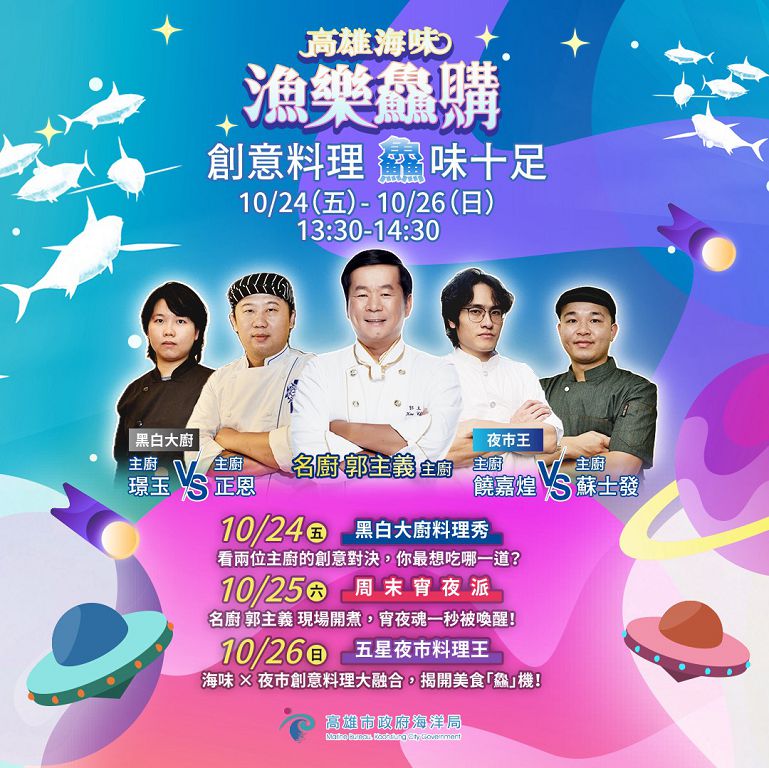 除了展售各式精選海味商品外,高雄海味專區活動更是精采不斷,10月24日至26日每天13時30分至14時30分,在「高雄海味舞臺專區」推出人氣主廚創意料理秀,以精彩廚藝詮釋高雄海味的多元風貌與創意應用,三天連番登場;10月24日《黑白大廚料理秀》-全羅道韓式料理高雄店「璟玉主廚」與槿韓食堂「正恩主廚」正面交鋒,韓味激戰即將上演;10月25日(六)《周末宵夜派》-邀請人氣名廚郭主義現場開煮,喚醒你深夜的海味魂;10月26日《五星夜市料理王》-人氣餐車漢堡粉絲「蘇士發主廚」與激飢叫海鮮「饒嘉煌主廚」攜手登場,以創意夜市料理掀起海味新風潮,想暸解更多海味專區活動資訊請上Facebook「高雄海味地圖-高雄市政府海洋局」粉絲專頁https://www.facebook.com/kaohsiungoceanmap 查詢。