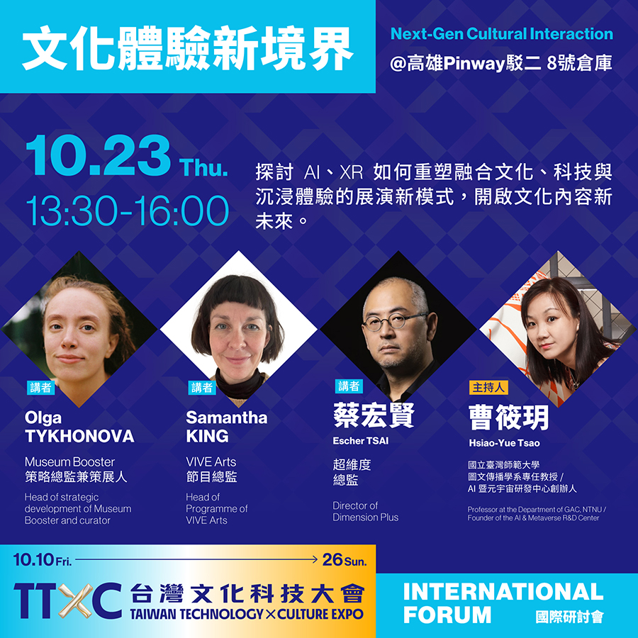 文化局指出,這屆TTXC首度舉辦國際研討會,將於22、23日兩天,在Pinway駁二八號倉庫舉行,6場重磅講座,邀集來自臺灣、英國、日本、韓國、美國等全球的文化科技領域先驅、產業專家與政策決策者,共同探討虛擬製作、沉浸式體驗、IP娛樂應用與創新場域,以及生成式AI的未來發展趨勢。