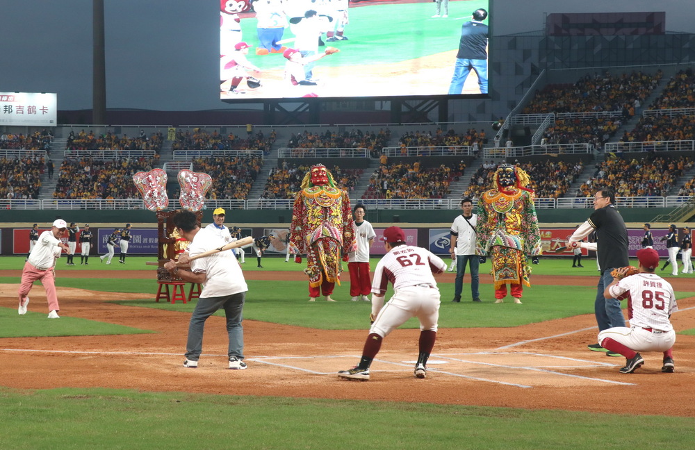 張善政指出,今晚比賽特別邀請桃園慈護宮與中壢仁海宮主神蒞臨觀賽,象徵「雙媽同場」庇佑球隊、凝聚地方向心力。現場球迷熱情吶喊、加油聲不斷,展現桃園人對球隊的支持與信心,也讓宗教信仰與運動賽事在此交織,成為一場兼具文化意涵與地方活力的盛會。