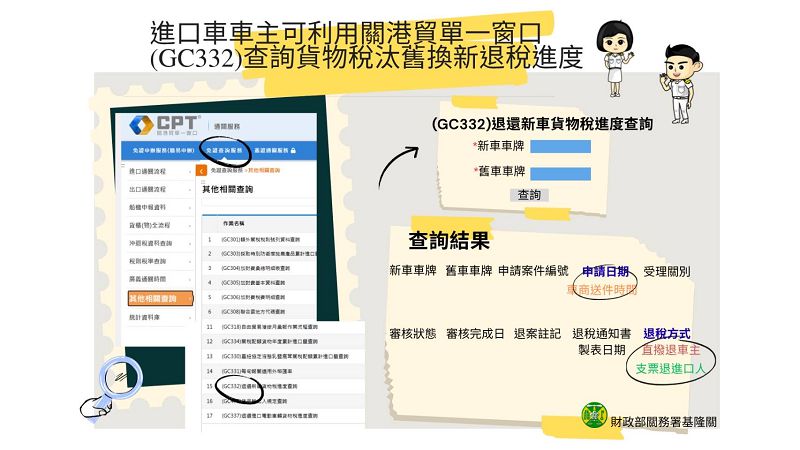 基隆關說明,車主可自「關港貿單一窗口首頁/通關服務/免證查詢服務/其他相關查詢」中找到「(GC332)退還新車貨物稅進度查詢」選項,或直接在首頁以關鍵字「GC332」搜尋即可連結。