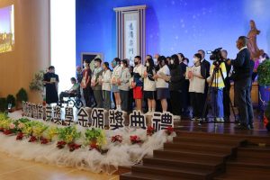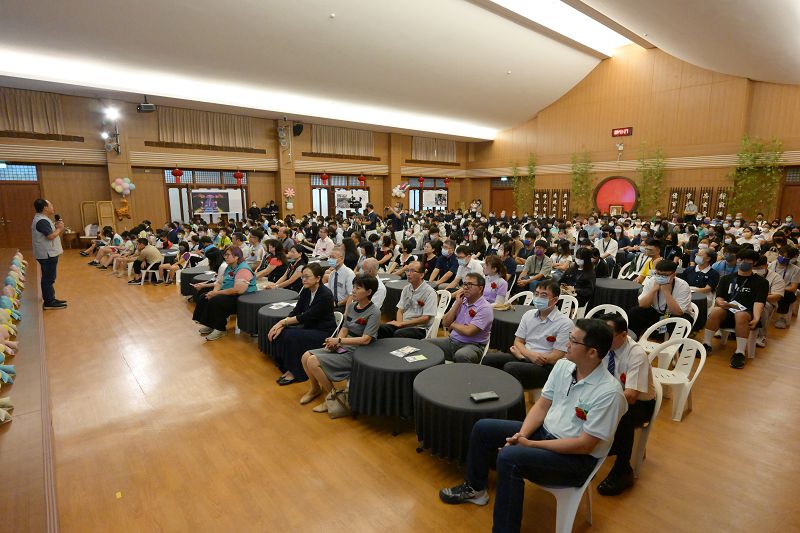 在典禮前時刻,佛堂螢幕上播放花蓮縣光復鄉災情,慈濟投入救災影片,當災情發生後,假日台鐵車廂坐滿人潮,不是遊玩觀光,而是出現穿著著雨鞋,帶著鏟子的超人,湧現各式各樣的鏟子超人,人間啟發的愛心,台灣人真美。