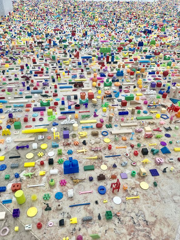展覽大廳滿地鋪滿各式各樣袖珍型兒時玩具等,琳琅滿目,彩色繽紛,充滿童趣,美不勝收。原來是美國藝術家瑞安甘德的傑作,著重兒童嬉戲和想像力的作品。