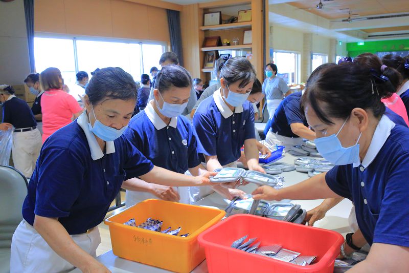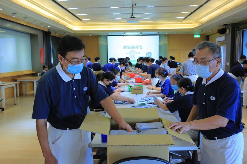 志工迅速主動就動線位置,從拆包裝盒、插卡、放藥膏、說明書至裝箱,大家安住各自的崗位,以三個小時的時間完成組裝工作。