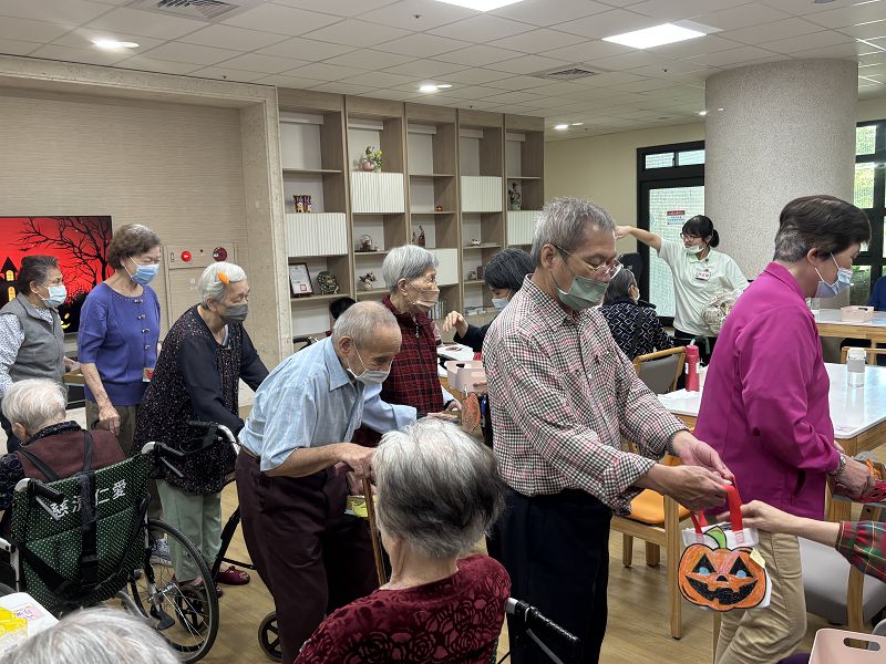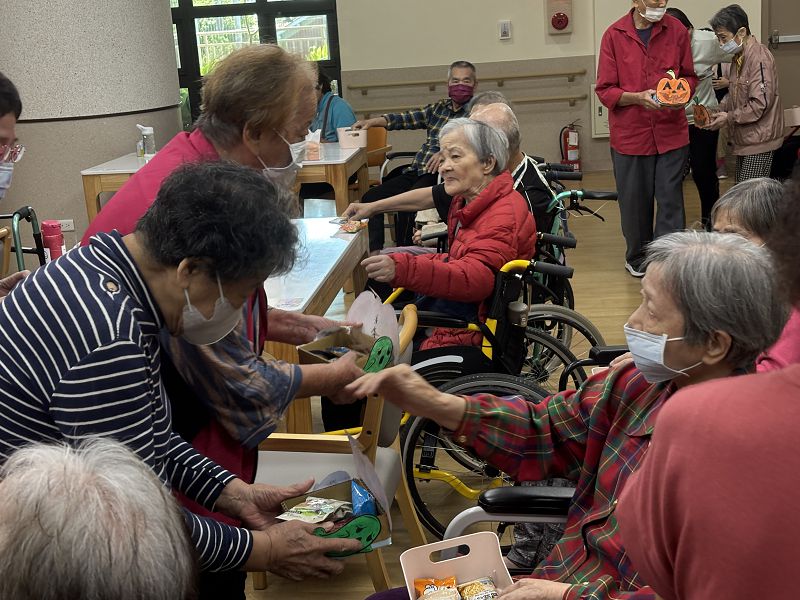 有的長者拿到餅乾後,一片一片品嘗。發點心過程中,社工帶著日照長者說:「不給糖就搗蛋!」雖然阿公阿嬤們不太懂這種西洋節日的來由和意義,不過藉著年輕社工們安排的創意趣味活動,阿公阿嬤們也跟著玩得不亦樂乎。還有長者頑皮地拿小籃子來裝糖,令人會心一笑。一整個上午,仁愛長照機構上下樓的氣氛被炒到最高點,長者們臉上堆滿笑容。