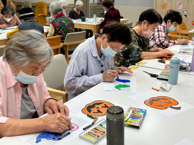 10月31日一早,社工帶領一樓日照中心的長者畫圖、做頭飾,有的長者套上黑色塑膠袋變裝。十點半左右,日照長者們浩浩蕩蕩從一樓分批至二樓、三樓和五樓,來到長照長者面前,由長照長者互相分送給其他日照的長者餅乾、糖果等點心。