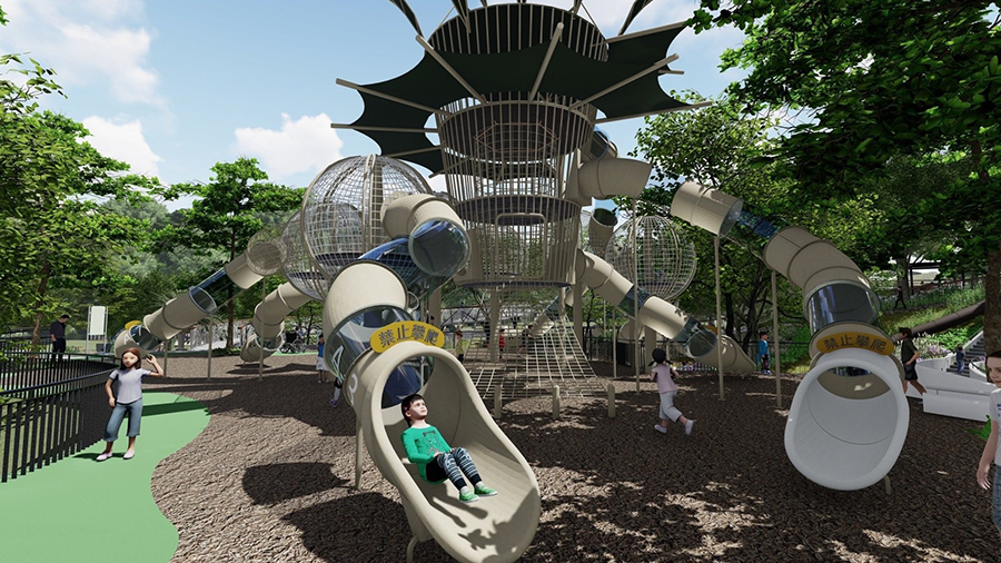 建設局表示,鰲峰山「谷溜遊戲場」基地面積達3,500平方公尺,總經費7,600萬元,目前工程進度已近50%,預計於115年3月完工,工程內容包含主題遊戲塔、共融沙坑、高架歷史棧道等多元設施,並設置多達34道各式溜滑梯,打造兼具挑戰與趣味的遊戲空間,同時以通用設計理念規劃友善無障礙通道及遊具,整合既有體健區,滿足不同年齡層民眾的使用需求,也呼應市民對公園建設的期待。