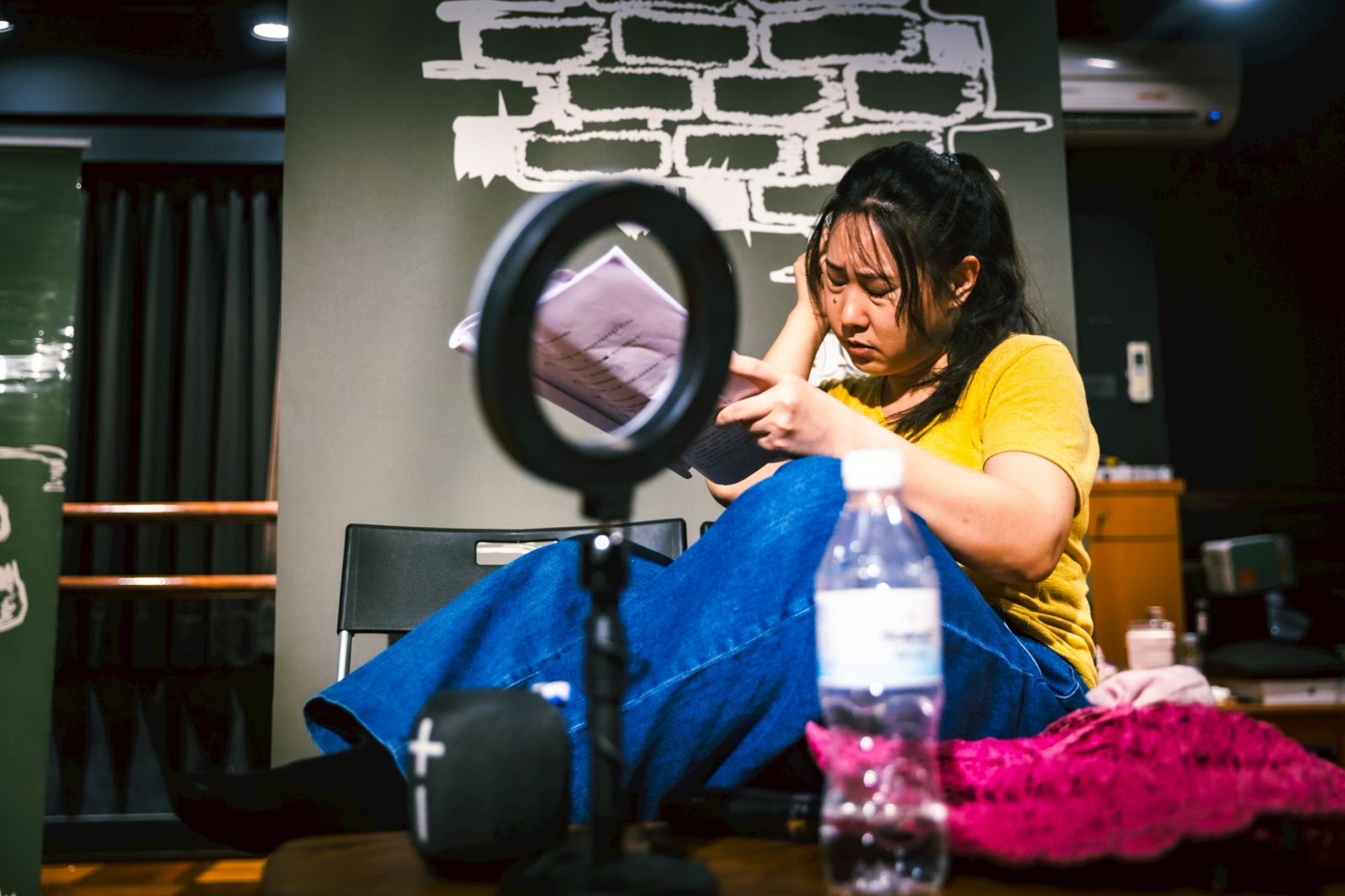 演員置身鏡頭環境,專注翻閱劇本,映照自媒體時代的真實掙扎。(攝影林善淳)