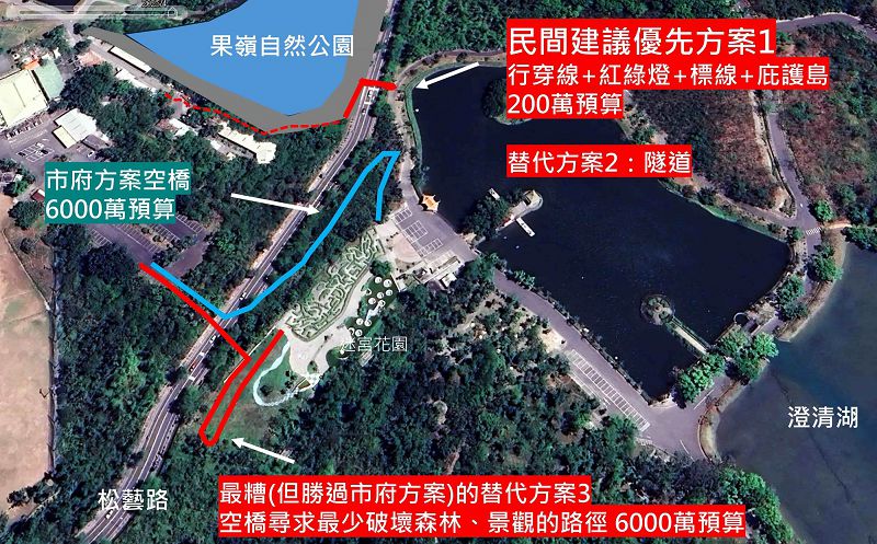 尤其,果嶺公園與澄清湖之間,僅一條雙線車道的松藝路,只要設置紅綠燈和行穿線,搭配標線與庇護島設計,預算200萬元即可搞定,根本不需要做天橋,就能滿足行人與自行車穿越需求與安全,且不需要破壞森林、破壞飲用水保護區的水土保持,與妨礙風景區景觀。