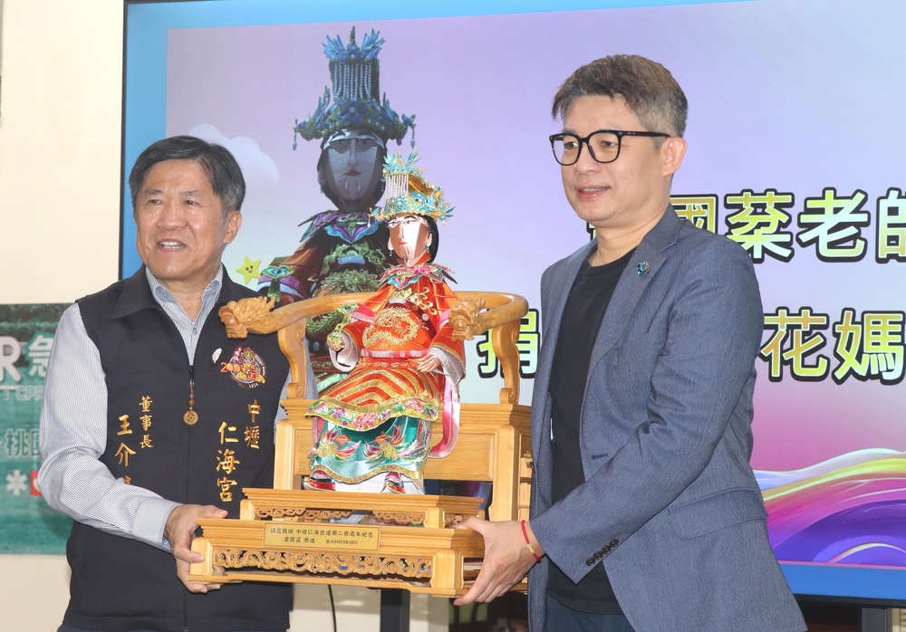 王介禧表示,今年是中壢仁海宮建廟二百週年,特別與桃捷公司合作推出限量超可愛Q版中壢媽造型紀念儲值卡,象徵著信仰與生活的結合,同時很榮幸邀請傳統纏花藝術家曾國棻與簡鳳雪老師共同聯展纏花藝術作品,也感謝贈送「纏花媽祖與劍獅」作品。另外,亞洲電台郭董事長非常發心捐贈三尊大神尊給本宮慶賀200週年,真的非常感謝。