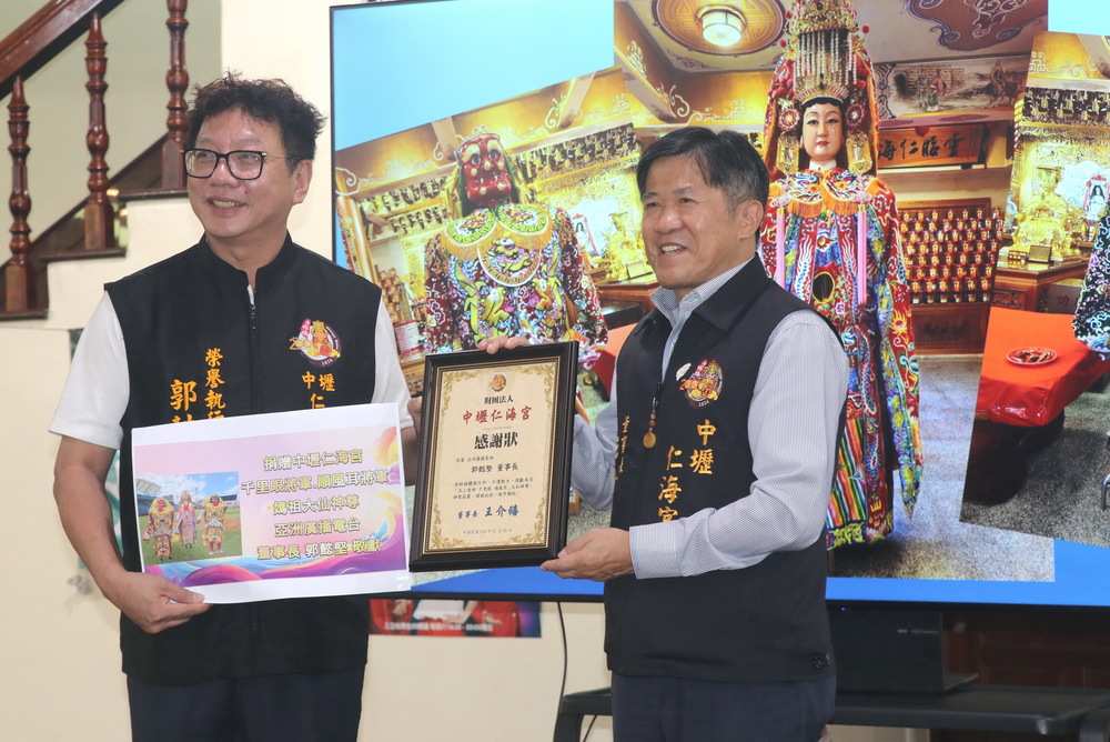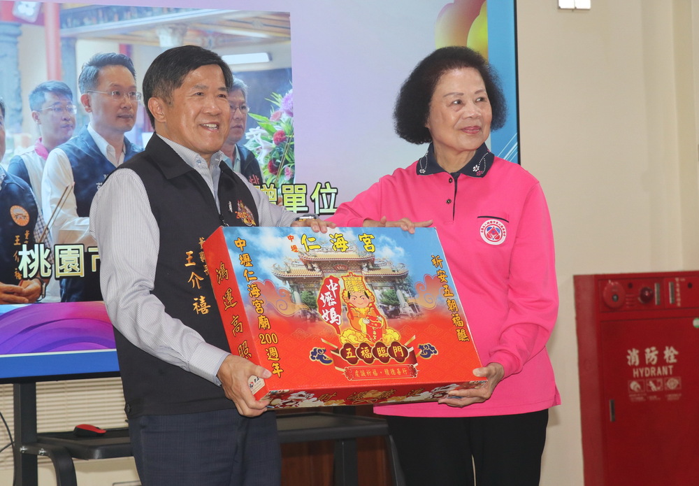 【記者鍾陽正桃園報導】中壢仁海宮為慶祝建廟二百週年,特別結合交通、藝術與公益三大主軸,於日前在後殿舉辦「桃捷x仁海宮200週年紀念儲值卡發表會、曾國棻傳統纏花藝術創作展暨公益物資捐贈」活動,由董事長王介禧主持,並與中壢區長李日強、桃園郵局局長康嘉芳、亞洲電台董事長郭懿堅、桃園捷運公司經理張明義、仁海宮副董事長鍾福晉暨董監事及福醮局全體執事等人,為這場別具意義的宗教文化慶典揭開序幕。會中也舉行亞洲電台董事長郭懿堅捐贈「媽祖、千里眼將軍、順風耳將軍」三尊大神像予仁海宮儀式,讓會場處處洋溢著祝福與感動。