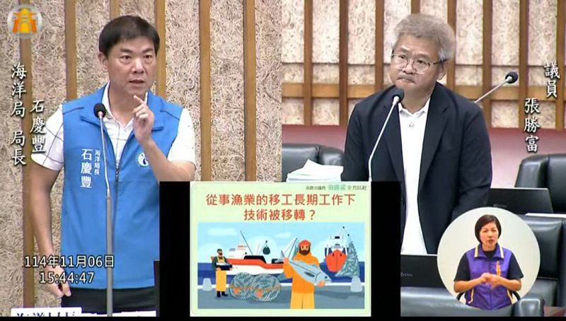 張勝富指出,時下年輕人從事漁業愈來愈少,雖船長與大副都是台灣人,但其他漁工大多是外勞,他們是否學會了捕撈技術就偷偷轉移回國,應如何防範?海洋局長石慶豐回答,目前養殖漁業大都採智慧養殖,其中水質監測是重要技術,而遠洋圍網漁船部分,則是探測及掃瞄雷達,漁工雖懂得操作,但返鄉後卻沒有相關硬體設施可用,加上漁民也很小心謹慎,所以技術不會被轉移。