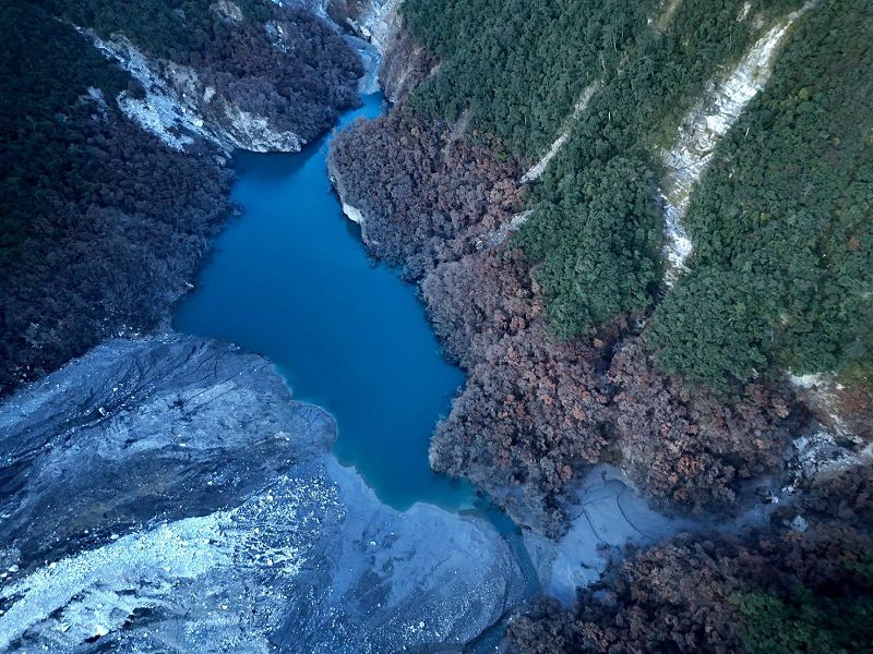 堰塞湖潰決後,天然壩體積約1.1億立方公尺,目前溢流口下游坡度平緩(6度),無潰決跡象;溢流口左岸還有約1億立方公尺的土砂堆積在坡面,9月25日至11月9日僅崩崖陡坡局部崩塌,無明顯整體邊坡滑動跡象。