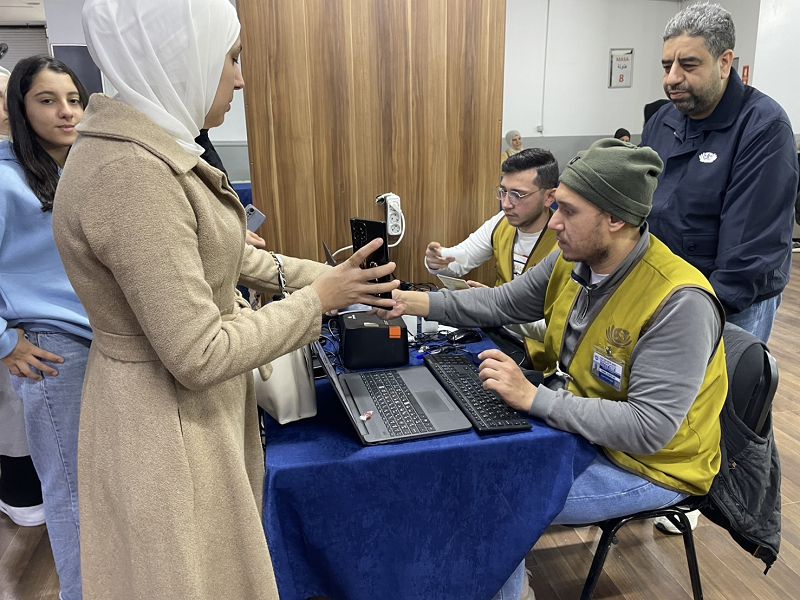 志工們陸續抵達會場,協助敘利亞鄉親確認身分、蓋手印,引導家長與孩子們入座。整個校園井然有序,溫馨祥和。