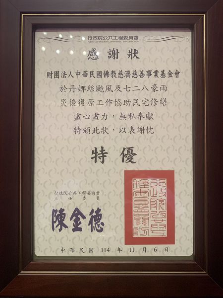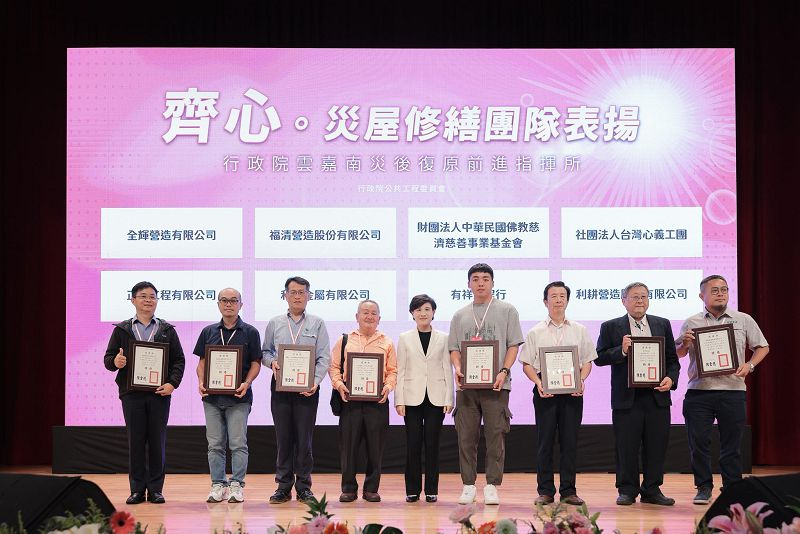 行政院公共工程委員會11月6日舉辦「雲嘉南災後復原協助廠商表揚茶會」,行政院副院長鄭麗君代表卓榮泰院長頒發感謝狀,向全臺72家投入災後修繕的營造單位致敬。其中,佛教慈濟慈善事業基金會獲「特優」肯定,由營建處中部營建室主任曾展陞代表領獎,表彰慈濟在災後重建工作中展現的專業與慈悲。