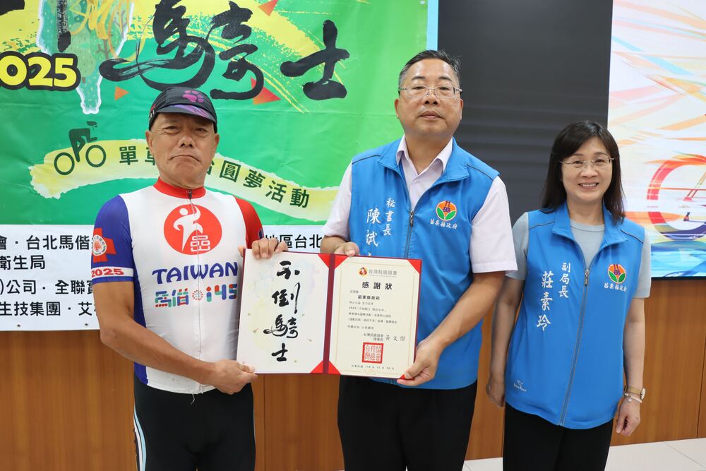 【記者林盈焜、羅玉女苗栗報導】由台灣抗癌協會主辦的2025年第13屆「不倒騎士 騎出生命」單車環台圓夢活動,從11月2日至11日舉行全程約1100公里,集結50位癌友及親屬共同騎乘。車隊10日抵達第9站苗栗縣政府,獲秘書長陳斌山、衛生局副局長莊素玲熱烈接待,並致贈「騎驥天涯 幸福苗栗」錦旗,表達對所有癌友的敬意與祝福。