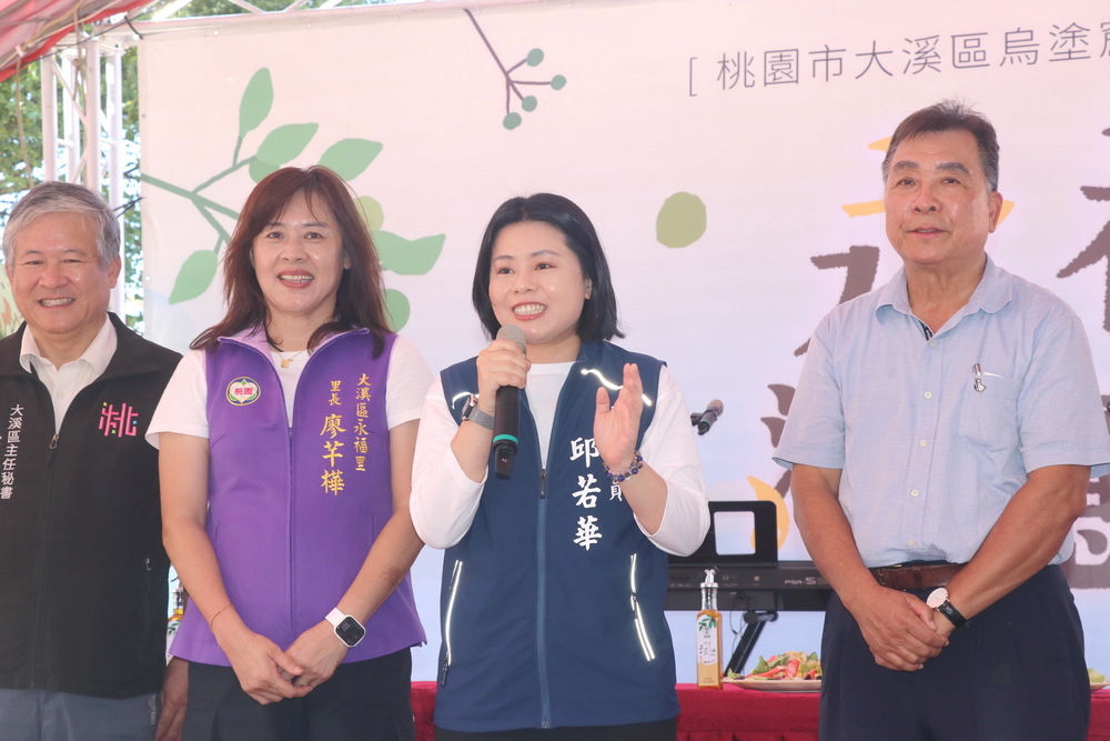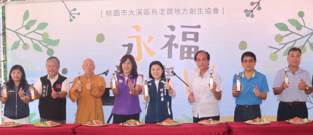 【記者鍾陽正桃園報導】桃園市大溪區烏塗窟地方創生協會主辦「苦茶油文化體驗節」,於日前在大溪區永福里龍山寺前廣場熱鬧登場,吸引眾多的民眾、親子家庭、周邊各協會及農場代表等前來共襄盛舉。活動由理事長王勝智與立法委員邱若華、市議員李柏坊、永福里長廖芊樺、和平禪寺釋宗皇師父、農業局科長張瓊霙、大溪區公所主秘吳清曉等人手持苦茶油完成象徵祝福的料理示範而為活動進行揭幕,場面處處洋溢溫馨歡悅,展示出永福「以食連結人心、以油串起文化」的地方精神。