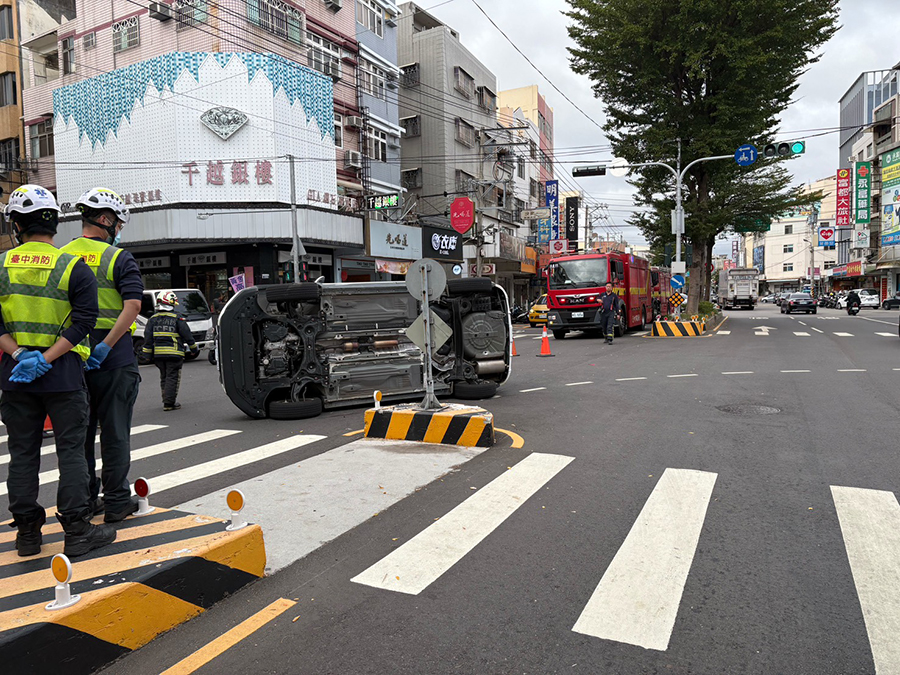【記者楊川欽台中報導】女子駕車行經沙鹿區中山路與沙田路口,不慎擦撞行人庇護島後翻覆,駕駛與乘客驚人協助脫困,二人受傷送醫。該案發生於11日下午3時許,在沙鹿區中山路與沙田路口,林姓女子駕駛自用小客車,疑似未注意前方路況,左前車頭擦撞行人庇護島後向右翻覆,駕駛及乘客由路人協助自後車箱脫困,駕駛腹部擠壓傷(無明顯外傷)、乘客左腳輕微骨折,二人均意識清楚,被送醫治療後無大礙,汽車駕駛經酒測後無酒駕情事,該案將依規定製成相關資料,移請交通警察大隊分析研判肇事原因及責任。