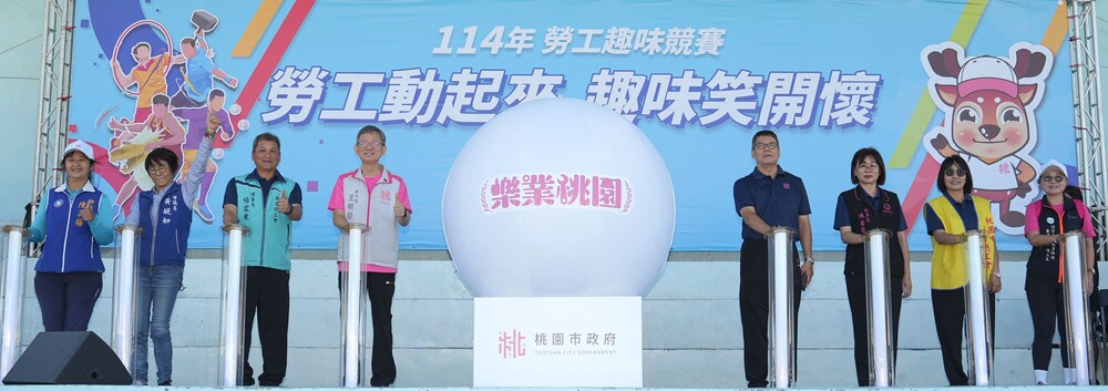 【記者鍾陽正桃園報導】桃園市副市長王明鉅日前在市議員黃婉如、市議員陳美梅、市議員黃家齊、桃園市勞動局局長李賢祥、衛生福利部中央健康保險署北區業務組專門委員楊玉美、勞動部勞工保險局桃園辦事處主任陳正和、桃園區區公所副區長邱創正、桃園市總工會理事長陳若蘭、桃園市職業總工會理事長楊震東、桃園市產業總工會理事長施淑華等人陪同下,前往桃園區出席「勞工動起來 趣味笑開懷」桃園市114年勞工趣味競賽。