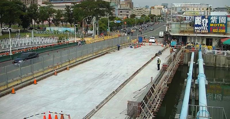 工務局新工處表示,媽祖港橋改建後的橋梁全長59公尺、橋寬拓增至25公尺,採鋼構梁型式,未來往前鎮將提供3車道、往鳳山方向2車道及安全人行道,大幅提升通行效率與安全性。為強化捷運黃線隧道潛盾施工安全,在媽祖港橋改建同時投入經費約1億元,啟動捷運黃線行經媽祖港橋路段下方橋墩的地質改良作業,使上下游側橋梁改建時程合計多花費約1年時間,目前整體進度91.97%,超前5.3%,下游側已在去年7月提前開放通車,目前上游側鋼梁吊裝與橋面混凝土澆置已完成,正進行伸縮縫、人行道、護欄、路燈與標線等最後工序,將於114年12月底全線開放通行。