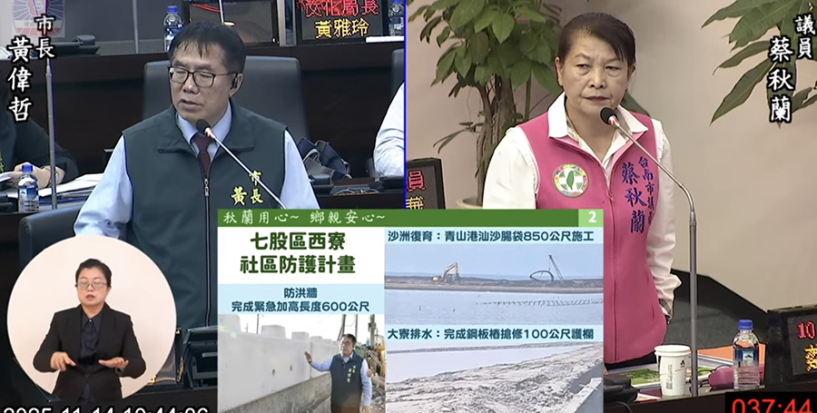 【記者鄭永德台南報導】今年7月丹娜絲颱風重創大北門地區,台南市政府跨局處幫助災民,市議員蔡秋蘭日前在市政總質詢時給予高度肯定與讚揚,對於中央全額補助1,2億元補救網仔寮沙洲破口及青山港沙洲堤岸下陷,蔡秋蘭要求水利局在明年颱風季前完工;佳里區第1處社會住宅本月初動工,蔡秋蘭也為當地買不起房子的年輕人發聲,盼比照台北等四都規劃「睦鄰戶」及就學、就業民眾提高中牽率,讓更多南科外溢市民願意在大北門區生活。