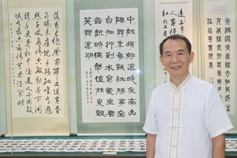 鄭添煌表示,回顧這11年學書法歷程,真的體會到學書法是一條堅辛的路程,雖然很辛苦,還是要努力的往前行,它是一條不歸路。在名師教導,到處聽專家講座,加入藝文學會,雅集社群,跟書法先進,同好交流切磋,不斷努力臨寫,參加各種比賽,揮毫等活動。今天能參加三人聯展,也是對自已的檢視,吸收前輩,同好意見,建議,為今後學書法走出比較好的正確道路。這次參加妙出偶然三人聯展,共有30副四開以上作品,以篆,隸,楷,行,草5體展現。其中有三幅心經以篆,隸,行書寫。李白:將進酒用篆書書寫(長3米寬0.5米。)李白:春夜宴桃李園序:用隸書書寫(長3米寬0.5米)。42張小品,書體有篆,隸,楷,行草,有一部份是創意作品。