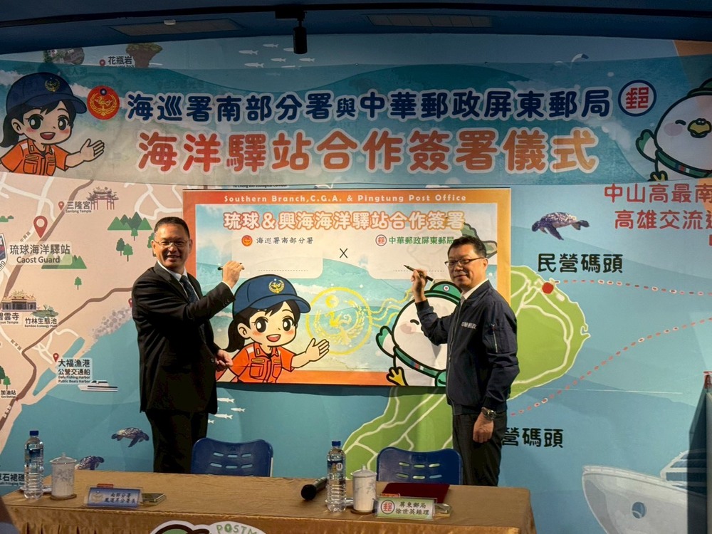 【記者范家豪屏東報導】中華郵政屏東郵局(18)日與海巡署南部分署於小琉球完成合作簽約,正式進駐「琉球海洋驛站」與「屏東興海海洋驛站」。這是郵政首次在離島啟動跨域場域共創,把郵政文化帶入海洋教育,打造兼具文化及旅遊魅力的新亮點。