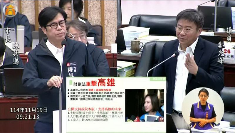 【記者于欽智高雄報導】高雄市議員鄭光峰19日於市政總質詢中指出,立法院版財劃法重傷高雄統籌分配款,議會國民黨團更集體阻擾地方總預算付委,聯手反制高雄建設預算,嚴重癱瘓高雄重大建設推動,直指背後就是身兼三項重要職務的柯志恩出賣高雄建設,讓高雄財務雪上加霜無力回天。