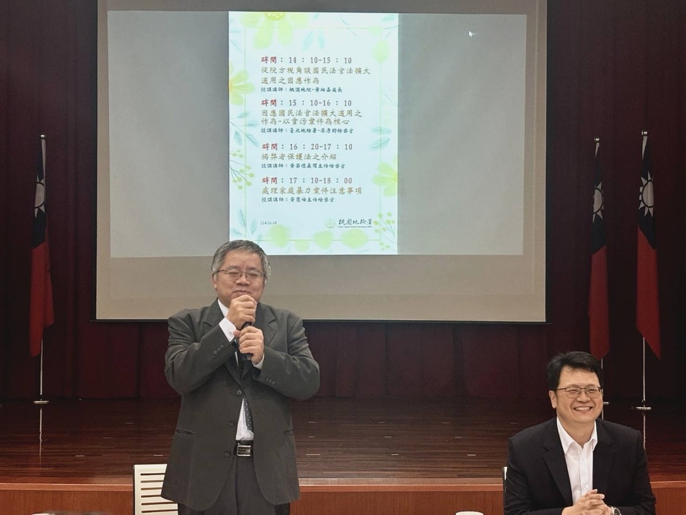圖說2:檢察長戴文亮(左)表示,國民法官法明年起將擴大適用案件類型,屆時更多重大刑案將由國民與職業法官共同審理。襄閱主任檢察官黃榮德(右)也說明,這次教育訓練更能強化偵查專業能量,確保執法品質與程序正義兼顧。(圖/桃檢署提供)
