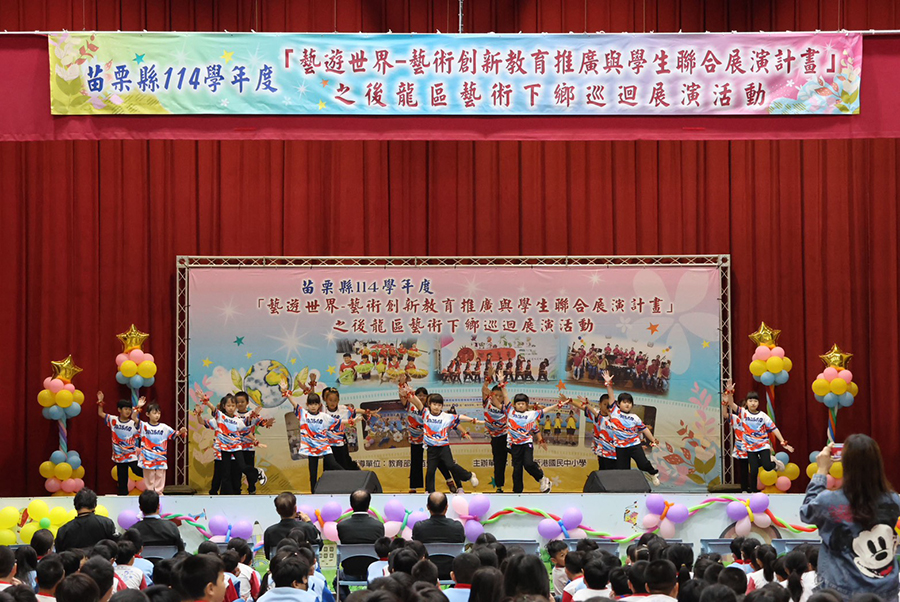 【記者林盈焜、羅玉女苗栗報導】苗栗縣藝術下鄉巡迴展演系列活動20日在後龍鎮新港國中小活動中心熱鬧登場,匯聚後龍地區 12 所國中小學生上台展演。苗栗縣長鍾東錦、議員林寶珠以及地方各級民意代表前往新港國中小活動中心欣賞孩子的精彩演出,開場由新港國中小演出〈彩色的苗栗〉揭開序幕。