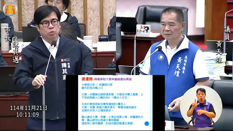 黃天煌議員指出,大寮居民盼望興建捷運「大寮林園線」已久,不知後續規劃如何?捷運局長吳嘉昌答覆,大寮林園線已納入路網評估,預計明年初送交通部審議。陳其邁市長補充,路網每10年檢討一次,本案已納入檢討,但財劃法修法恐排擠地方建設補助,盼中央在區域均衡下給予合理資源。