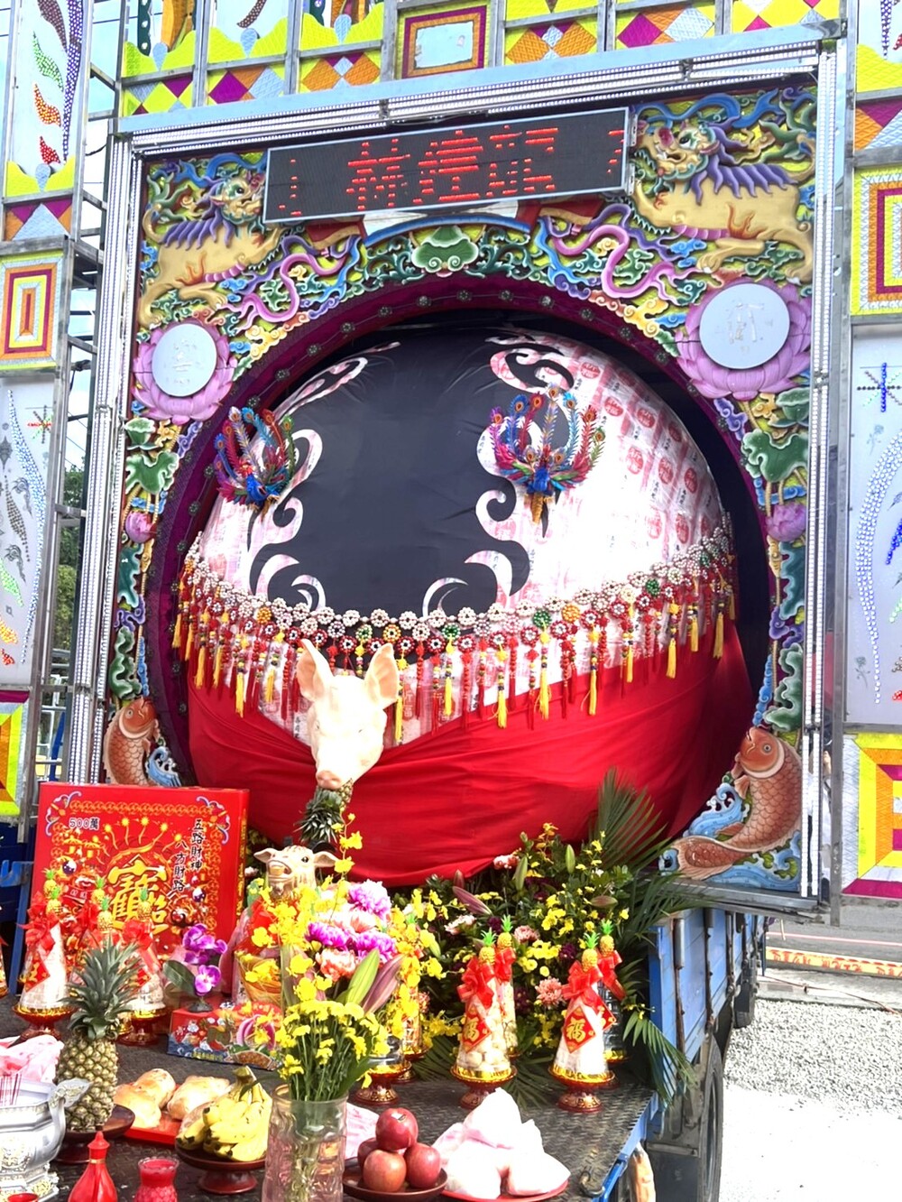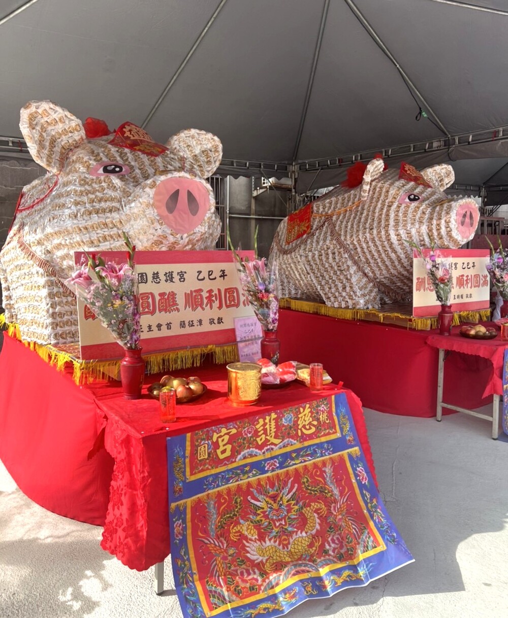 圓醮主委林建龍提供的大神豬,則是由高級壽司米組裝而成,重達600斤。香火鼎盛的桃園慈護宮,今年酬恩五朝圓醮慶典系列活動中,除延續傳統宗教信仰科儀外,更舉辦書法、寫生比賽等公益藝文活動,展現宗教創新與在地文化相結合。