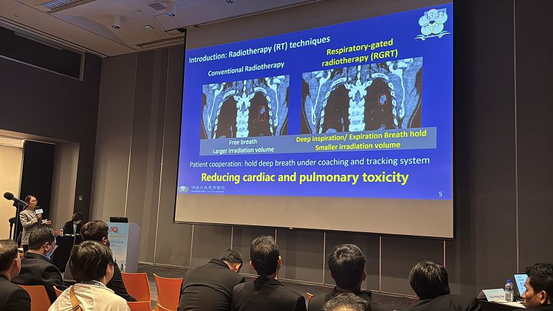 周嘉慧醫師指出,呼吸調控是精準放射治療的重要技術,尤其肝癌、乳癌及肺癌病人的腫瘤會隨著呼吸起伏而位移,若能協助病人穩定閉氣,不僅能減少正常組織受照射的風險,也能讓腫瘤鎖定更精準,副作用更低。