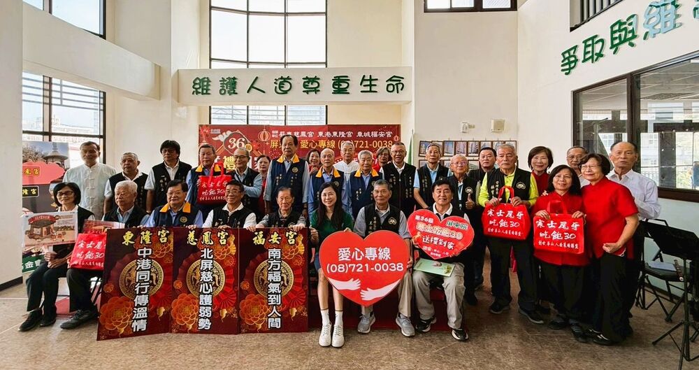 屏東聖帝廟廟慈鳳宮、東港東隆宮、車城福安宮、分別位於屏東縣北、中、南區,不僅是當地信仰中心,更是居民的精神支柱,三宮廟董事長與主委合力拼組屏東地圖,象徵集結全屏東的愛心幫助植物人,讓弱勢溫暖過年。