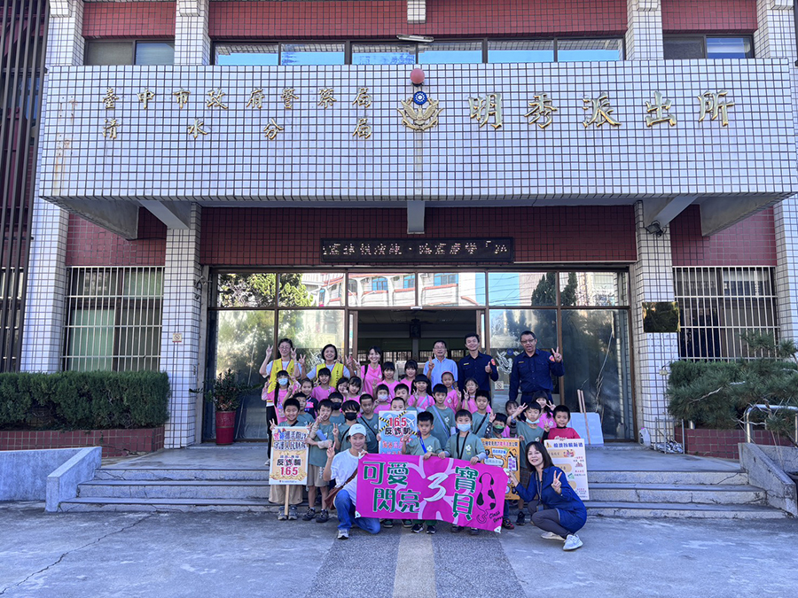 清水警分局明秀所副所長甘致宇與警員蔣承志、曾裕翔特別將防彈衣、酒測器、電擊槍、指揮棒等警用裝備一一展示,並讓學童穿上防彈衣、體驗取締酒測流程,加上警方生動有趣互動方式講解,讓小朋友身歷其境感受警察執勤的辛勞,其中有小朋友舉手向副所長反映「可以坐警車嗎,我阿媽坐過喔,因為不知道路,警察把她載回家喔」,警方也準備一部警車,並講解車上各種裝備及功能,警方隨即開啟警示燈及警笛的功能,讓現場小朋友驚呼連連。