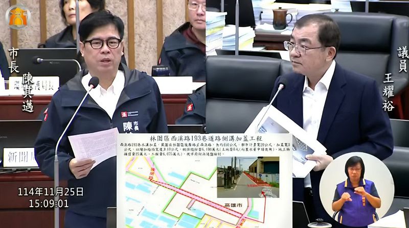 針對林園五福路252巷、溪州三路373巷拓寬及西溪路193巷側溝加蓋工程,王耀裕議員要求加速推動;陳其邁市長回應,需與農水署協調水路相關權責,將責成林欽榮副市長召集會議評估。