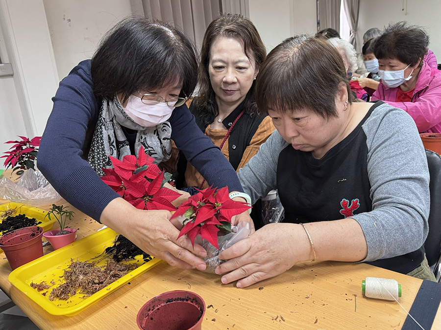 活動邀請綠照門甘明又老師帶領課程,偕同含羞草老師(正念協會吳錫昌理事長)、小蜜蜂老師(北投社大水電陳詩薇社長)及農會二位農業志工,結合綠照顧、綠療癒與綠呼吸概念,從植物介紹、手作示範到全程指導,陪伴長者以雙手感受自然、享受創作的樂趣。課程以節慶限定的「聖誕紅」為主角,搭配麋鹿公仔與苔球創作,營造濃厚的聖誕氛圍,讓長者們在歡笑中親手製作專屬於自己的節慶盆栽。