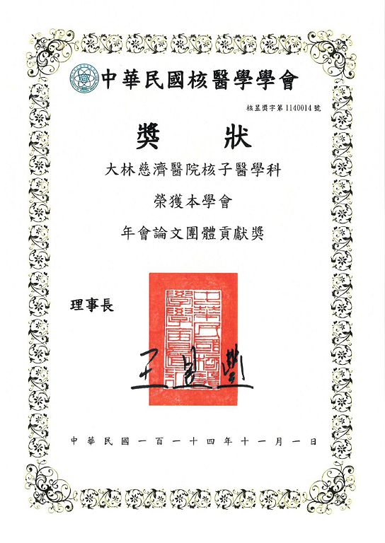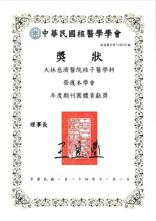 大林慈濟醫院核子醫學科在今年「核醫學學會年會」再傳捷報,一舉獲得「論文團體貢獻獎」與「期刊團體貢獻獎」,展現多年持續累積的研究能量與臨床創新成果。核醫科技術主任廖建國表示,這份榮耀不是個人的舞台,而是全科同仁共同努力的成果。「我們的研究文化已深耕十多年,每一位同仁都是點亮這份光亮的重要力量。」