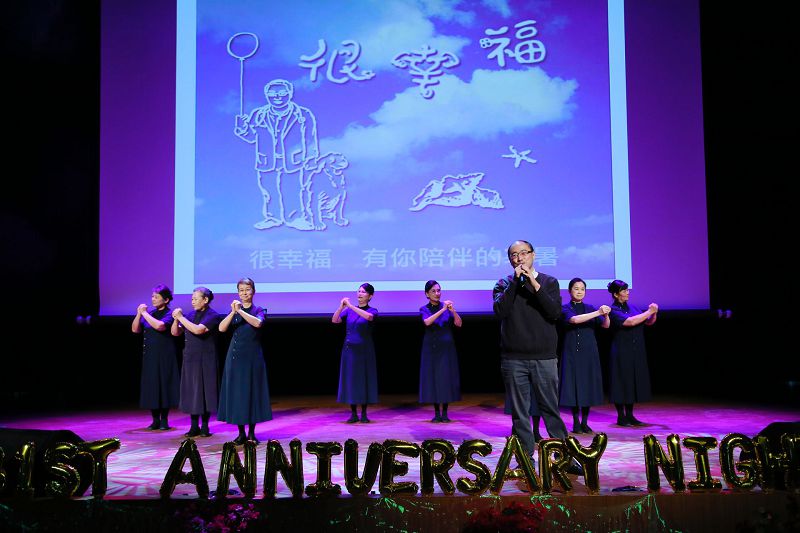 除了學生,慈大教職員也展現才華,組成披頭四樂團自彈自唱,多首民歌引起台下師長以及慈誠懿德會共鳴,跟著一起回到60年代的。