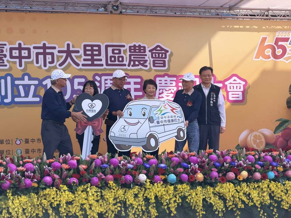農會總幹事賴東陽說, 大里農會創立105週年,好事成三!一、為照顧身心障礙者朋友們可以享有溫馨接送、暢行無礙之交通服務,特別在農會創立105週年慶祝大會活動會場,捐贈復康巴士1輛,贈與臺中市政府社會局,服務廣大市民朋友。二、捐贈大里區11處警消隊所購置救災器材及應勤裝備,提供辛苦警消同仁更全面性裝備守護鄉親安全,捐贈金額共計220萬元。三、贊助大里區轄內19所國小、國中及高中校務發展及運動民俗競技專長發展基金,以利照顧莘莘學子,共計135萬元。