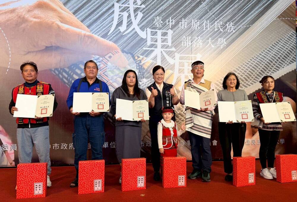 【記者彭勝郎台中報導】超過一萬名學員的力量發光發熱!台中市政府原住民族事務委員會29日於原民會一樓大廳舉辦「台中市原住民族部落大學成果展暨原住民族語傳承表揚活動」,由台中市政府原民會主任委員楊馨怡代表市長盧秀燕出席主持,與會近200位講師、學員、族語保母及志工齊聚一堂,共同見證一年來在文化教育與語言復振上的豐碩成果。
